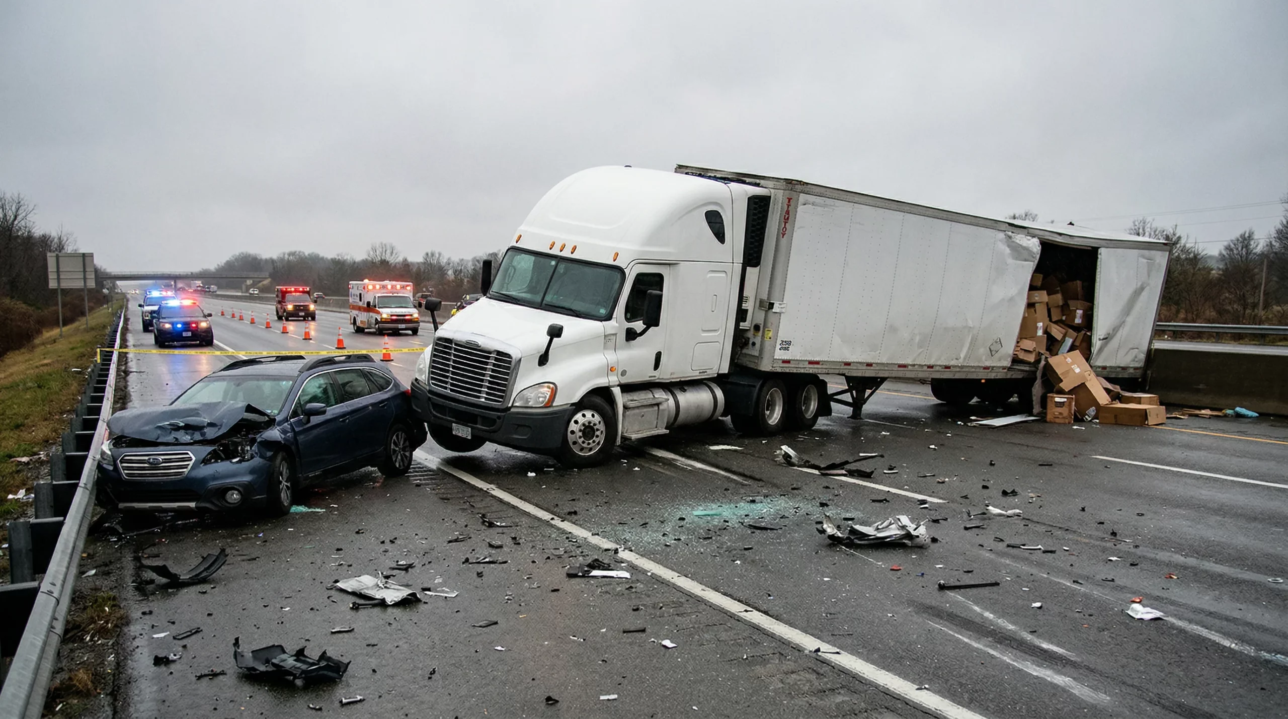 - High winds: Empty or lightly loaded trailers are particularly susceptible to crosswind rollovers. The open stretches of I-65 between Elizabethtown and Bowling Green see regular wind advisories that affect commercial vehicles.